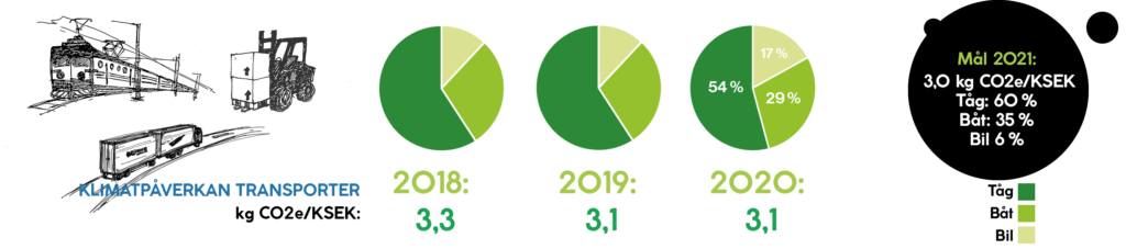 Transporter står för 9 % av vår totala klimatpåverkan och den procentuella fördelningen av transporter är enligt cirkeldiagrammen. Nyckeltalen visar vår klimatpåverkan i kilogram koldioxidekvivalenter (kg CO2e) för transporter per KSEK omsatt krona. Vår förändring i portföljen har gjort att vi inte nått upp till våra transportslagsmål men vi fokuserar på att optimera våra transporter.