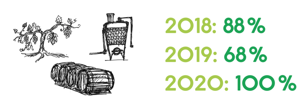 Odling och tillverkning står för 55 % av vår totala klimatpåverkan, vilket är högre än tidigare p.g.a. att vår egen verksamhets påverkan har gått ner kraftigt pga pandemin. Nyckeltalen visar hur många av våra aktiva producenter som skrivit på Systembolagets och därmed vår CoC i Worldfavor. Före 2020 hanterades CoC manuellt.