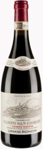 Campo San Giorgio Conero Riserva är Umani Ronchis prestigevin med ambition att nå högst upp bland Marches röda toppviner. Första årgången var 2009 och antalet producerade flaskor överstiger inte 3 000 flaskor. Montepulcianodruvorna kommer från två avgränsade vingårdsdelar i kommunen Osimo i distriktet Conero, Marches ledande rödvinsdistrikt.