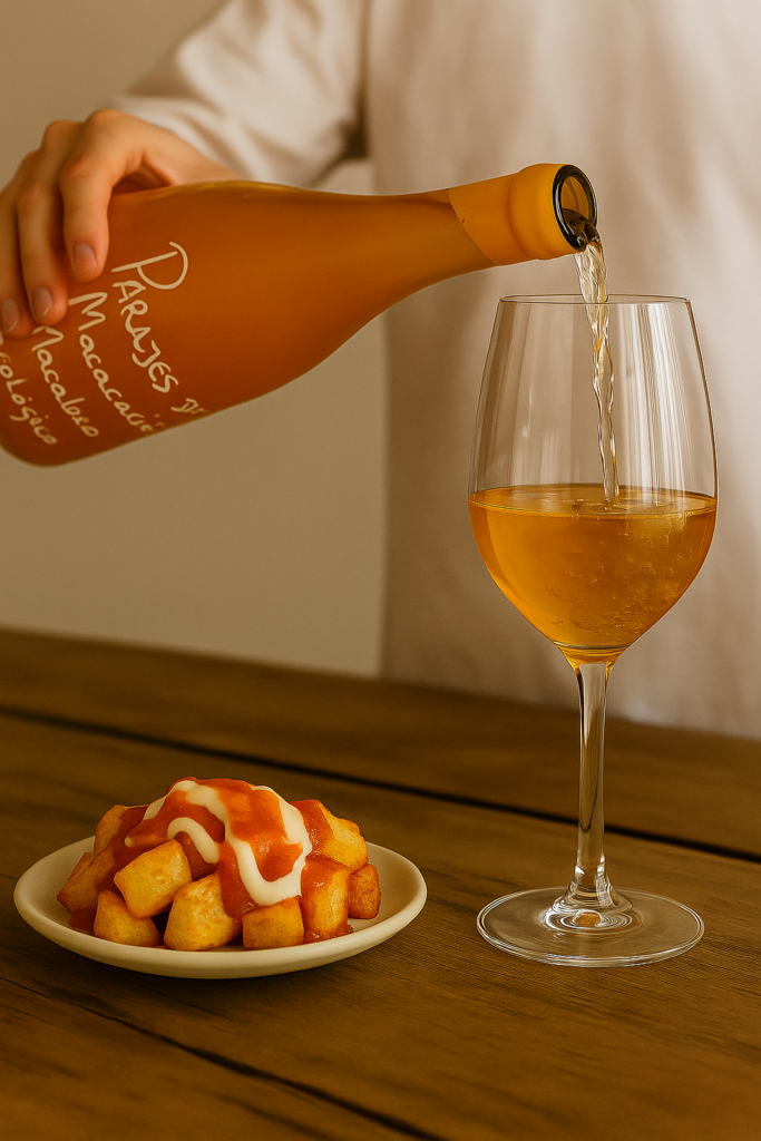En annan populär tapasrätt är en du kan hitta runt om i Spanien på i stort sett alla restauranger. Patatas Bravas är stekt eller rostad potatis i bitar, serverad med en kryddig bravasås. Om du inte får tag på salsan i din lokala butik kan du snabbt sätta ihop den i köket. Olivolja, lite vitlök, rökt paprikapulver, chili och eventuellt lite tomatpuré är allt du behöver för att skapa din salsa bravas. Till den här tapasrätten gör sig orangevinet Parajes Macabeo Maceracion med sin läskande syra och lättare struktur utmärkt. Med doft av grapefrukt och apelsinzest har vinet grepp i texturen av citrusfrukt och lätt beskt aptitretande avslut som gifter sig med den lätta hettan av Patatas Bravas.