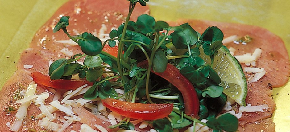 Carpaccio på rökt tonfisk med lime och parmesan