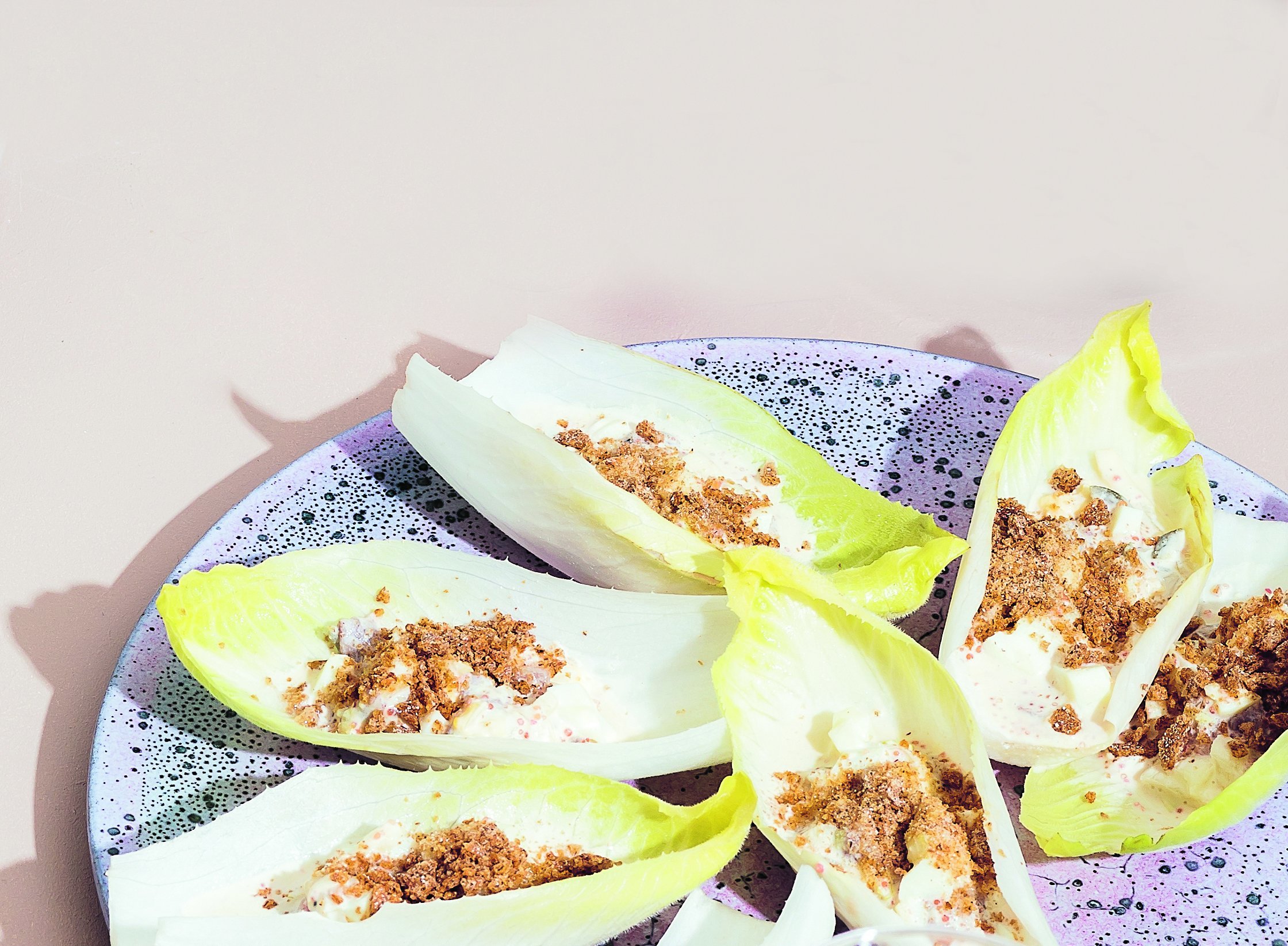 Endive med sill, äggröra och inlagd rödlök