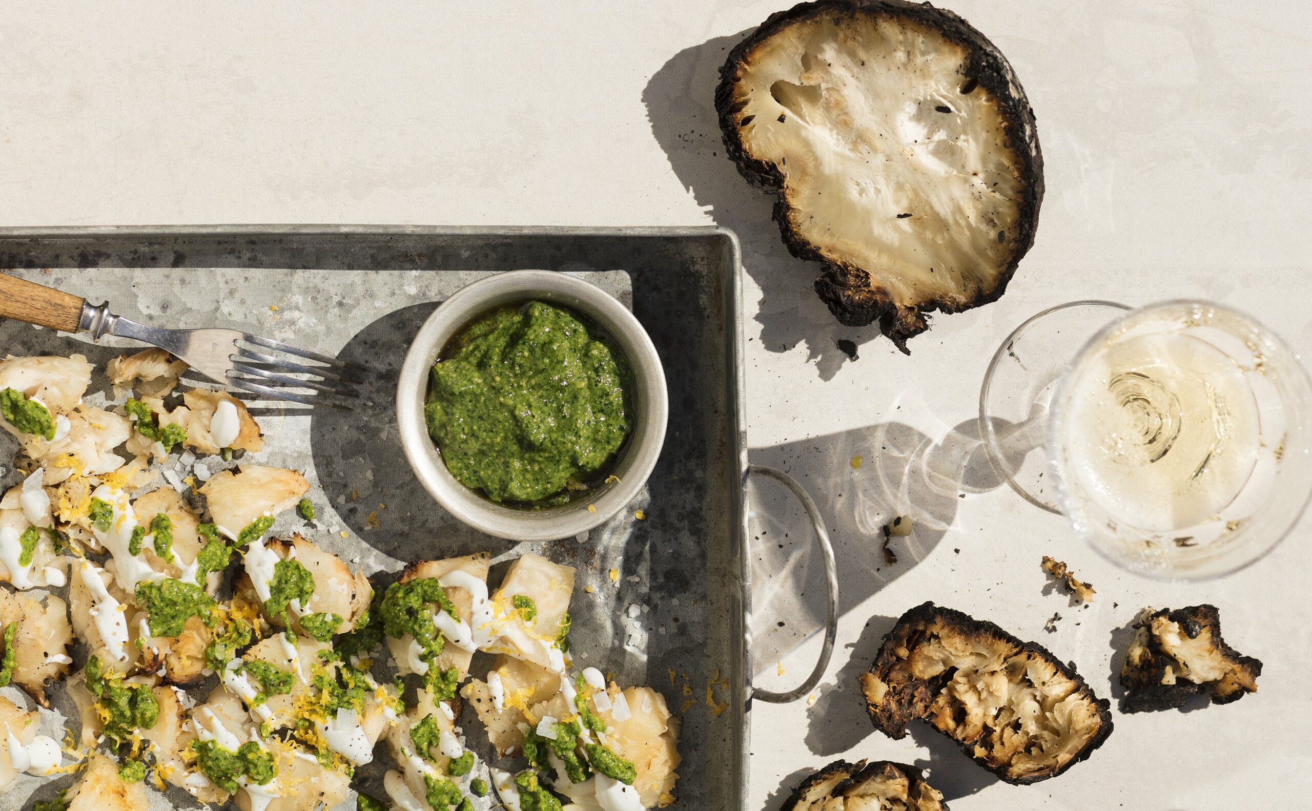 Grillad rotselleri med citron-gräddfil och svensk sommarpesto