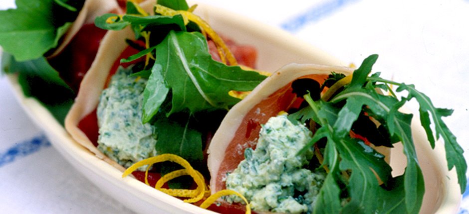 Parmaskinka, fylld med citron- och rucolacrème