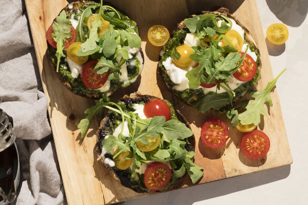 Portobello-pizza med chèvre, pesto, ruccola och körsbärstomater