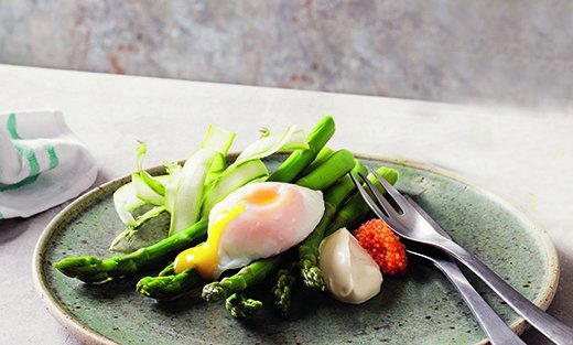 Sparris med pocherat ägg, löjrom och crème fraiche